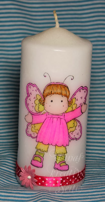 Gestern hab ich euch schon eines meiner Erstlingswerke gezeigt... die gescrappte Karte... und heute ist ein weiterer Erstling dran: eine bestempelte Kerze - natürlich gleich schön frühlingshaft, denn mir steht wirklich der Sinn danach! :)
