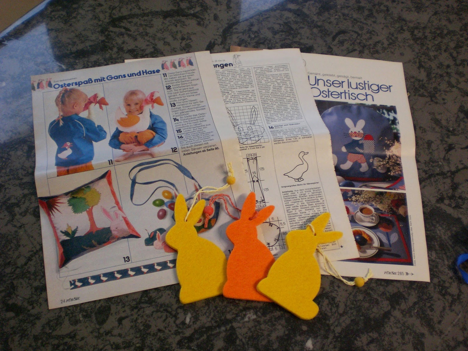 Liebevoll ausgesuchte Zeitungsausschnitte mit Bastel- und Nähanleitungen mit Hasis sowie drei Hasi-Filz-Hängerchen, die sind so süß ♥: