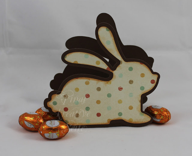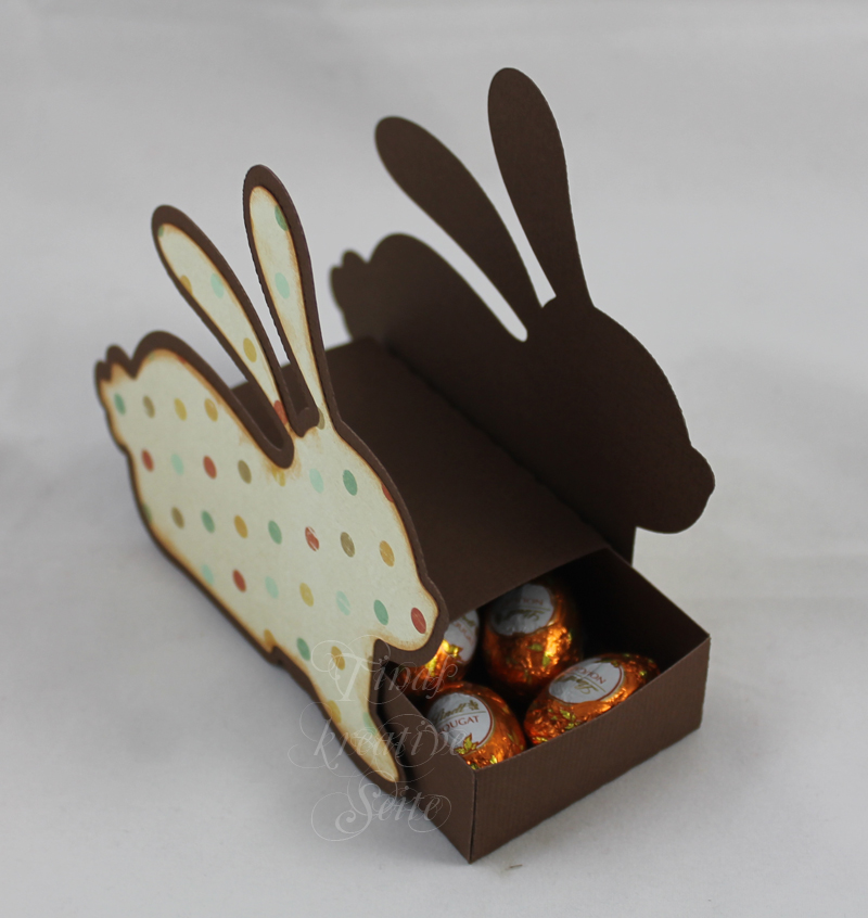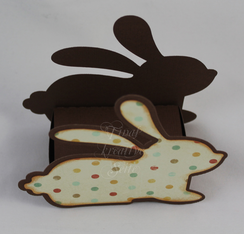 Zwischen den Hasis ist eine größere Streichholzschachtel eingebaut, in welcher sicher prima Mini-Schoko-Ostereier verstecken und damit auch verschenken lassen.