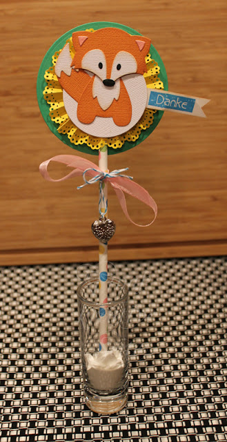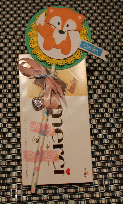 Ich hab mich dafür entschieden, die Lollipop-Karte mit Washi-Tape auf einer Schoki-Packung anzubringen. So kann sie auch ohne Beschädigung wieder abgenommen werden. Ich finde, es sieht sehr nett aus. :)