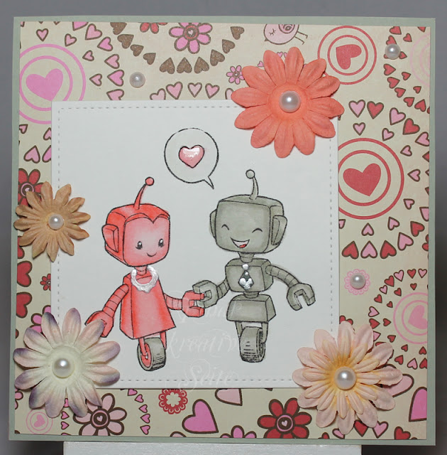 Da der Februar nicht nur mein Geburtstags-Monat, sondern auch wegen dem Valentinstag der Monat der Liebe ist, musste dieses süße, verliebte Roboter-Pärchen unbedingt auf die Karte drauf! ♥