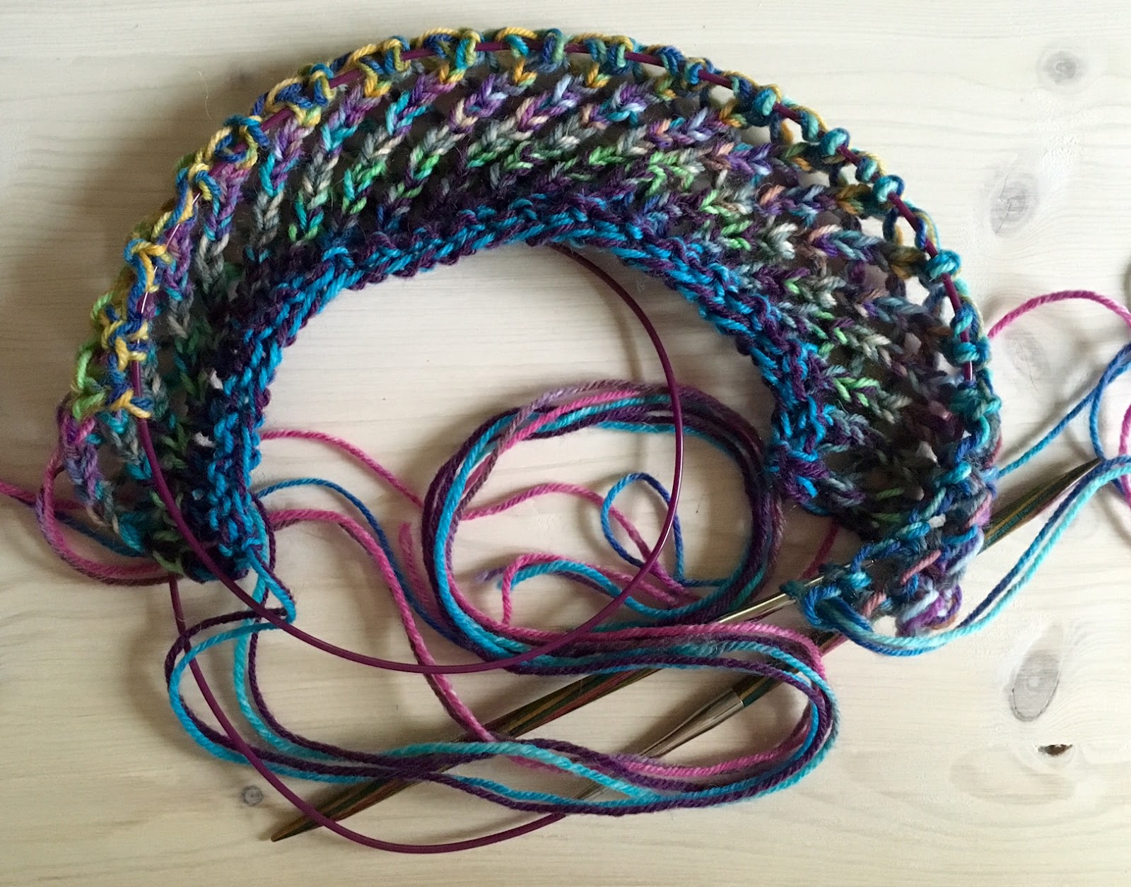 Ich hab vorm Loslegen gestern laaaaange überlegt, welche Wolle ich wo verwenden soll... und dann hab ich das verworfen und einfach impulsiv zwei Knäule geschnappt und durchgestartet. Es wird ohnedies dauernd die "Farbe" gewechselt... und außerdem ist es in der Chaos-Variante bestimmt noch "westiger"! *bestimmtnick* :)))